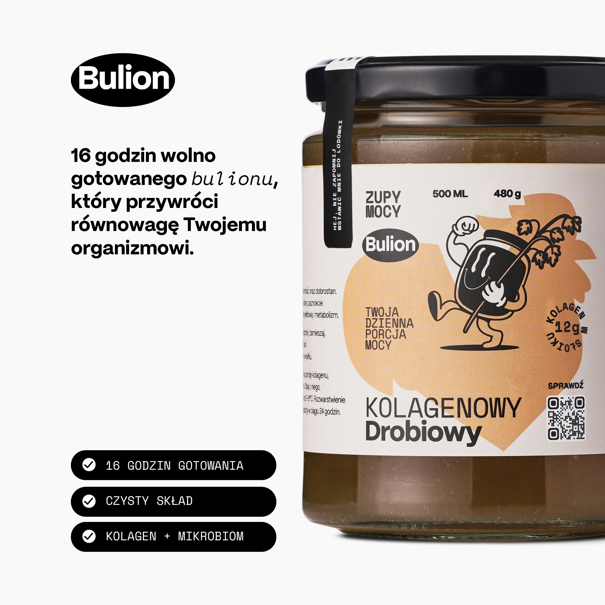 Odkryj siłę Zupy Mocy. Dzięki 14 g białka, naturalnemu kolagenowi i aminokwasom każda porcja wzmacnia jelita i odporność. Gotowy w 3 minuty – idealny, gdy potrzebujesz regeneracji i ciepła. Dla osób aktywnych, ale także dla osób osłabionych, w trakcie rekonwalescencji, seniorów oraz dbających o zdrową skórę i jelita. Rozgrzewa, wzmacnia, odżywia – codzienna porcja mocy w zupie. Pij solo lub dodawaj do zup i dań.