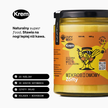 Żółty krem, który wspiera odporność od środka. Wolno gotowany na bulionie kolagenowym, z 12 warzyw i indyka — lekki, odżywczy i pełen naturalnej mocy dla jelit, skóry i regeneracji.