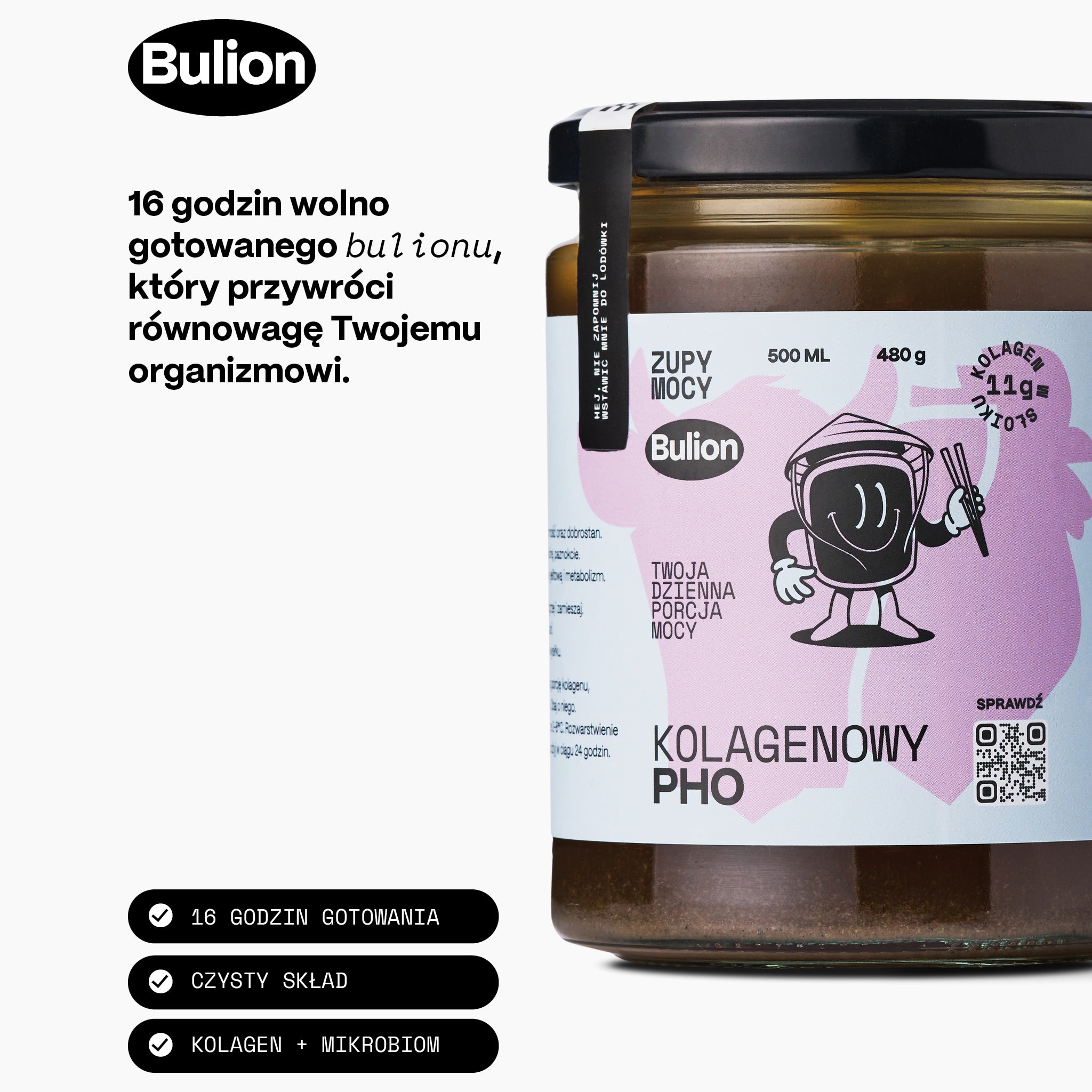 Odkryj siłę Zupy Mocy. Dzięki 16 g białka, naturalnemu kolagenowi, aminokwasom i aromatycznym przyprawom każda porcja wzmacnia jelita, odporność i zmysły. Gotowy w 3 minuty – idealny, gdy potrzebujesz regeneracji, rozgrzania i orientalnej nuty smaku. Dla osób aktywnych, ale także dla osób osłabionych, w trakcie rekonwalescencji, seniorów oraz dbających o zdrową skórę i jelita. Rozgrzewa, wzmacnia, odżywia – codzienna porcja mocy w zupie. Pij solo lub dodawaj do zup i dań.