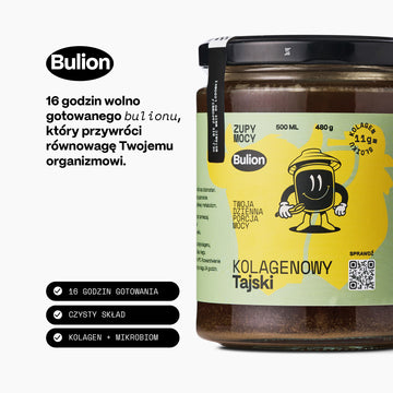 Przepis na nasz bulion został opracowany przez szefa kuchni i dietetyków, inspirowany tradycyjnymi tajskimi recepturami, by połączyć maksymalne wartości odżywcze z wyjątkowym aromatem. Długo gotowany z wyselekcjonowanego mięsa i kości wołowych, wzbogacony o trawę cytrynową, galangal, liście limonki kaffir i inne przyprawy, obfituje w kolagen, aminokwasy i minerały wspierające regenerację, odporność i dobre samopoczucie.