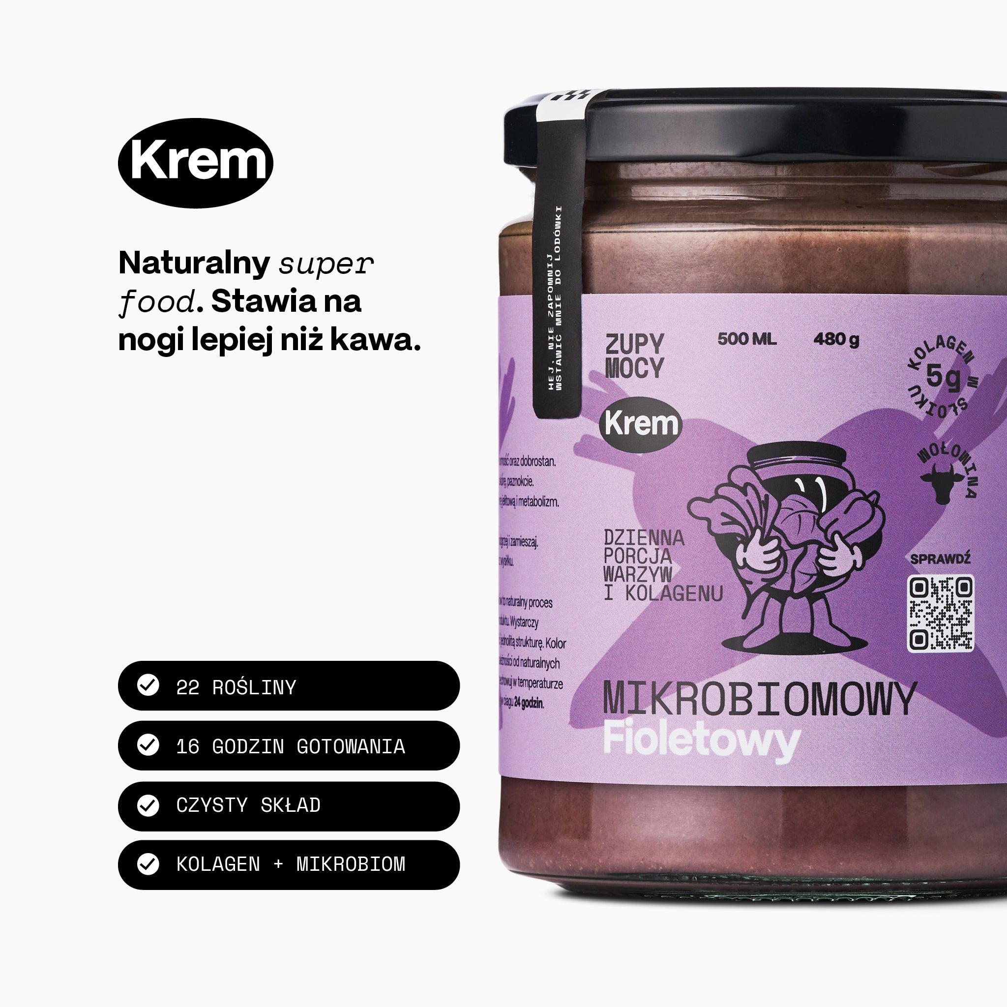 Fioletowy krem, który regeneruje od wewnątrz. Wolno gotowany na bulionie kolagenowym, z 10 warzyw i wołowiny — pełen naturalnych składników wspierających jelita, skórę i odporność.