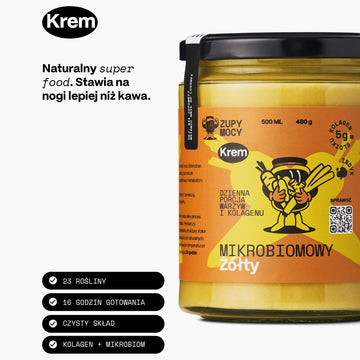 Żółty krem, który wspiera odporność od środka. Wolno gotowany na bulionie kolagenowym, z 12 warzyw i indyka — lekki, odżywczy i pełen naturalnej mocy dla jelit, skóry i regeneracji.